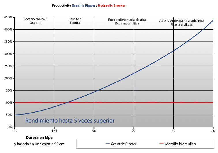 El Xcentric ® Ripper supera ampliamente al martillo hidráulico en el 80% de las aplicaciones de trabajo. En hasta el 70% de las aplicaciones de trabajo se puede obtener una produccón de 2 a 5 veces superior. Disponible en tamaños superiores a la gama actual de martillos y factible para la entrega de unidades gigantes.